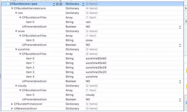 iPad的动态图标设置和上面步骤基本一样,有的文章说是将 CFBundleIcons 改为 CFBundleIcons~ipad,即: