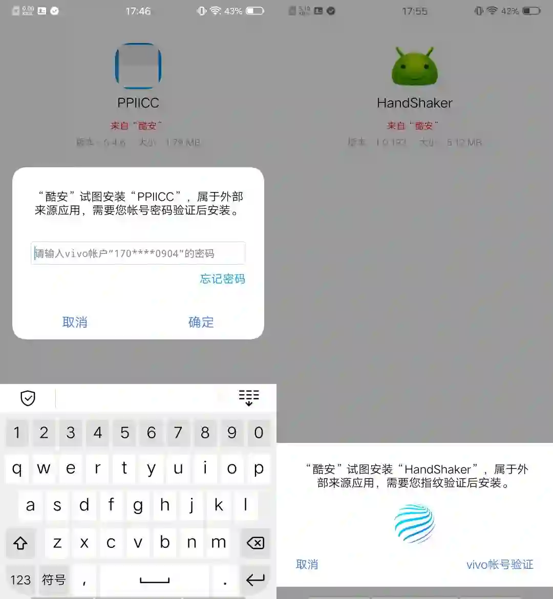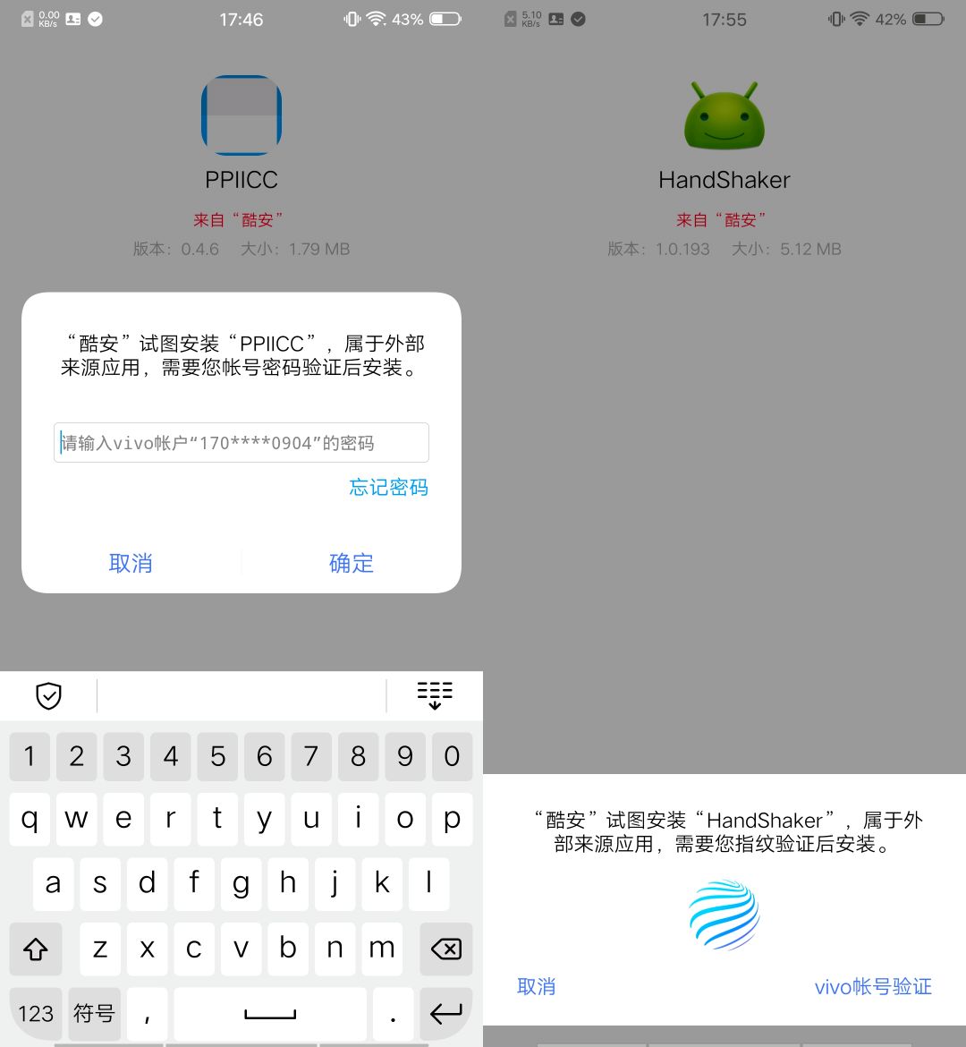 此外,通过第三方应用下载安装其他应用的话,必须要登录 vivo 账号并且每次要输入密码或者验证指纹。