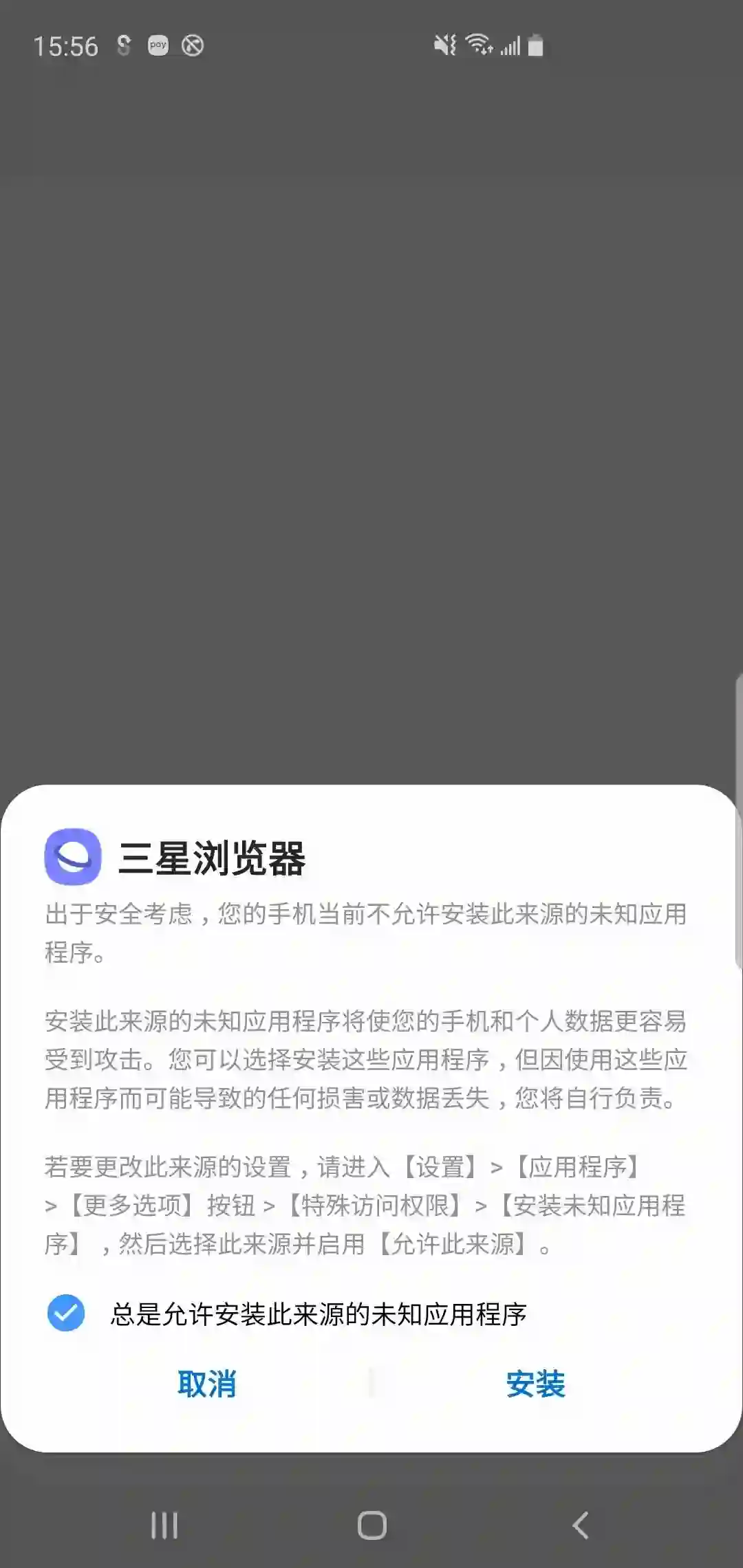 采用 One UI 系统的三星 S10+,对第三方渠道应用安装的限制比较少,不会检测应用安全性和推荐自家渠道,只会弹出一个提醒。
