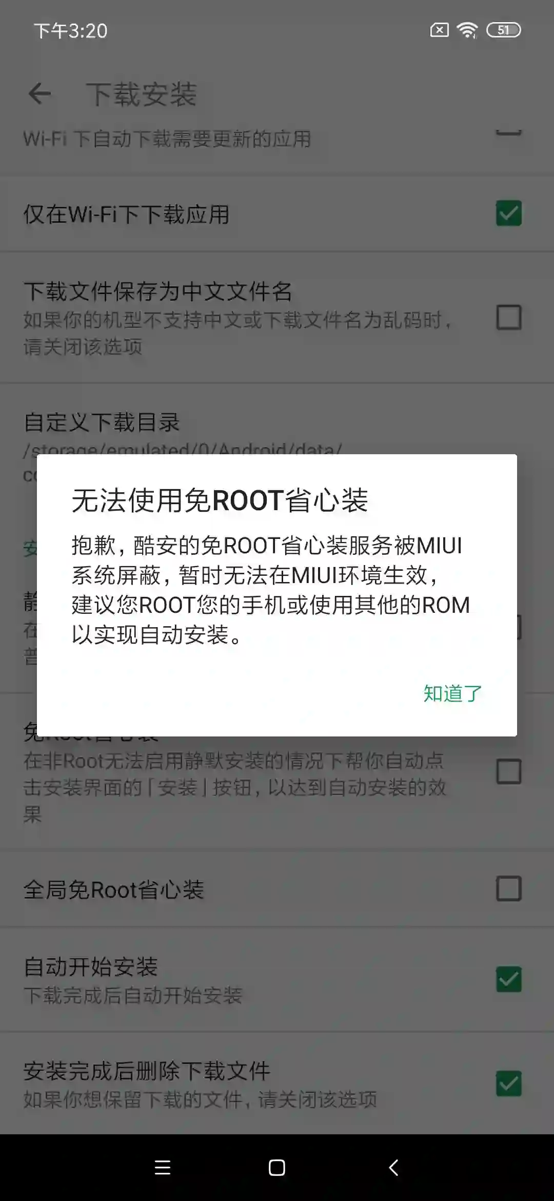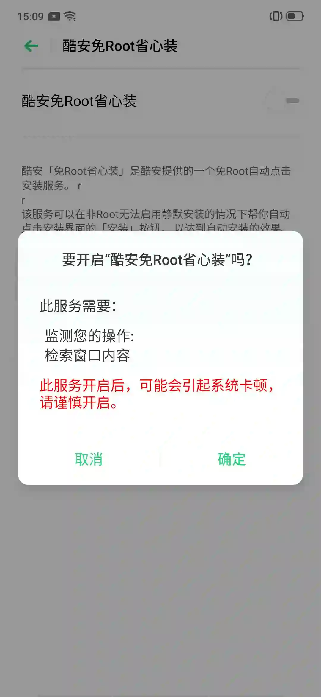 我们还尝试打开酷安市场设置中的“免Root省心装”功能,以简化应用安装的流程。不过,系统中出现了警示信息,而且开启后还是不能自动安装。