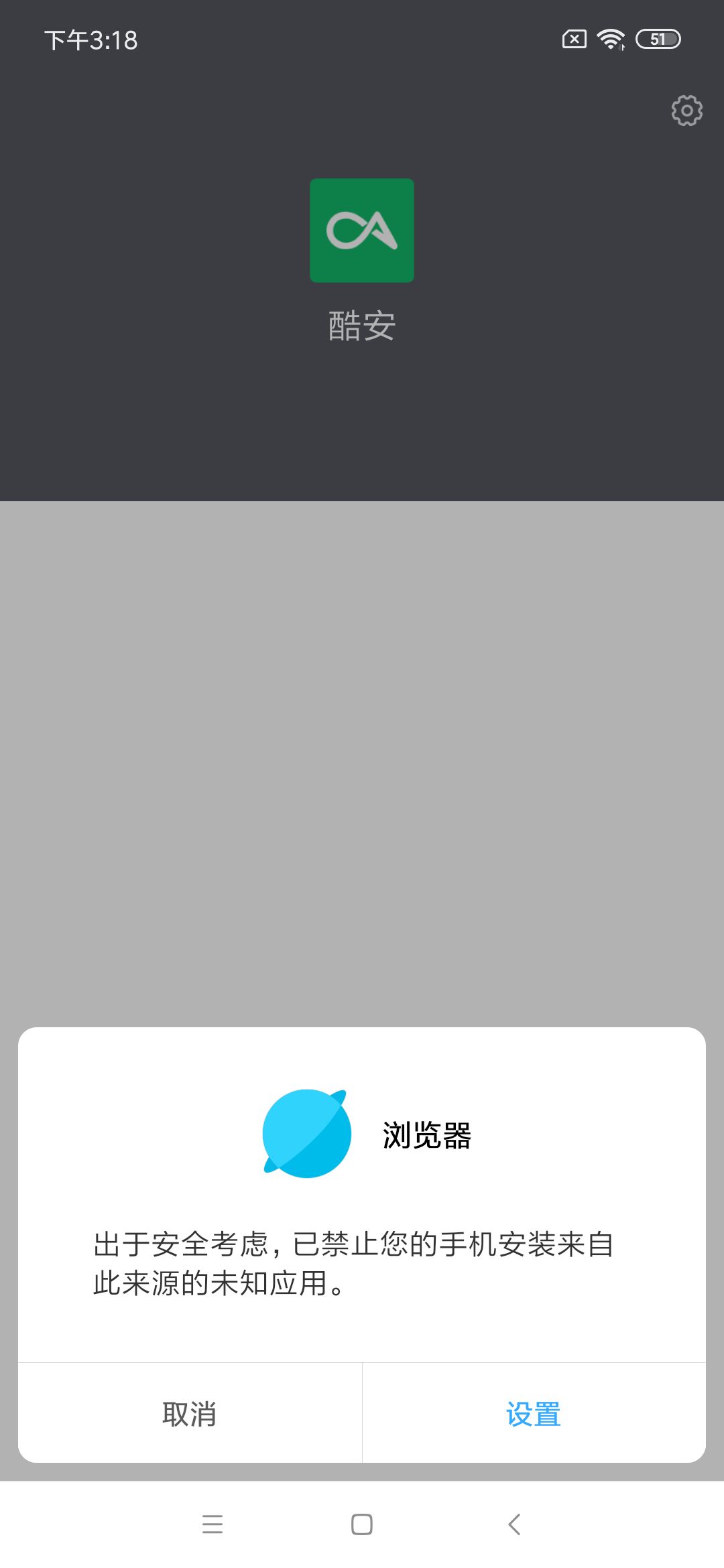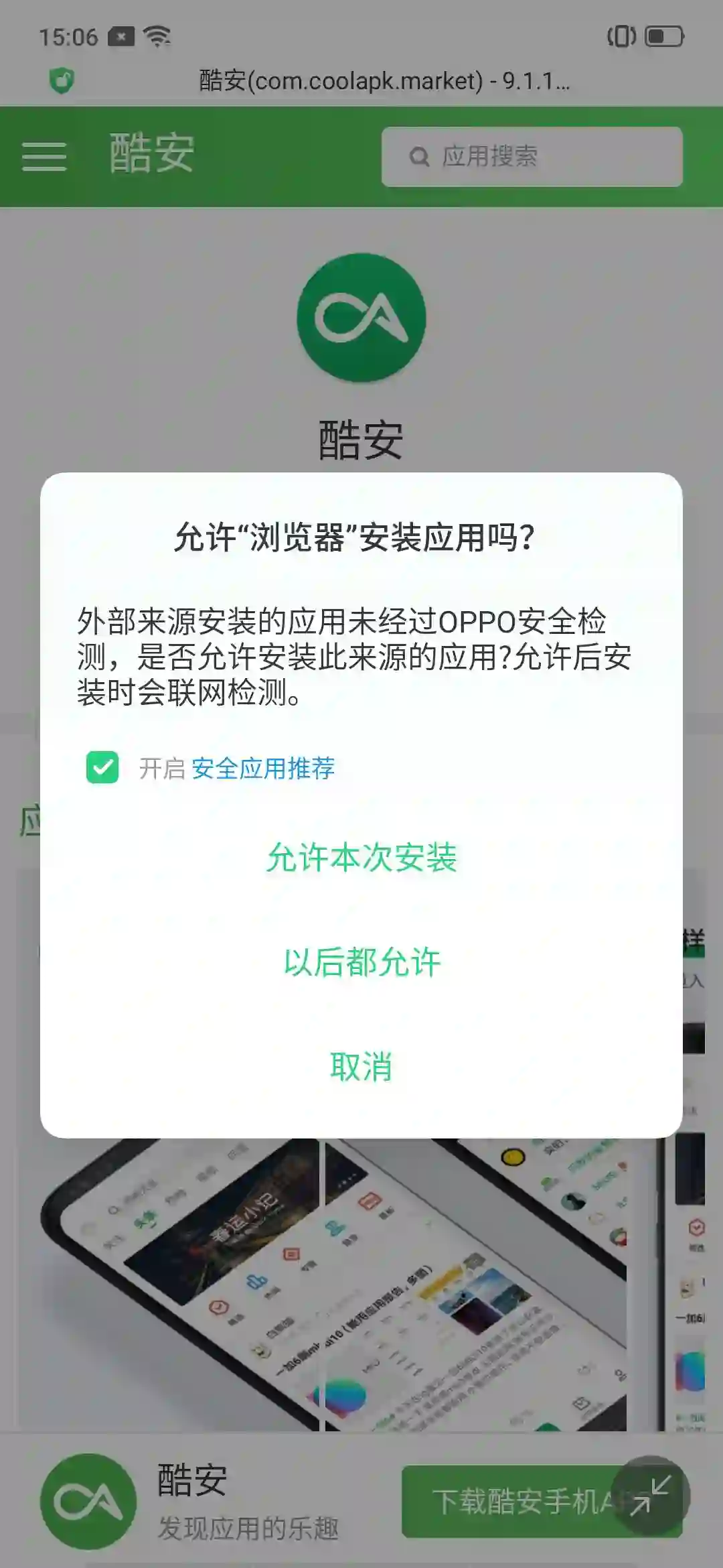 测试中,我们通过 OPPO Reno 的系统浏览器在酷安官网下载安装客户端,系统跳出弹窗提示是否允许安装应用,用户可以选择允许本次安装或者以后都允许。