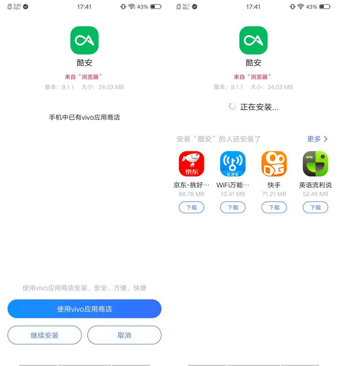 Funtouch OS 9 对第三方应用安装的限制非常多,通过系统浏览器下载的安装包,系统要强制扫描检测,同时会有 vivo 官方应用商店以及其他应用推荐,都不能手动关闭。