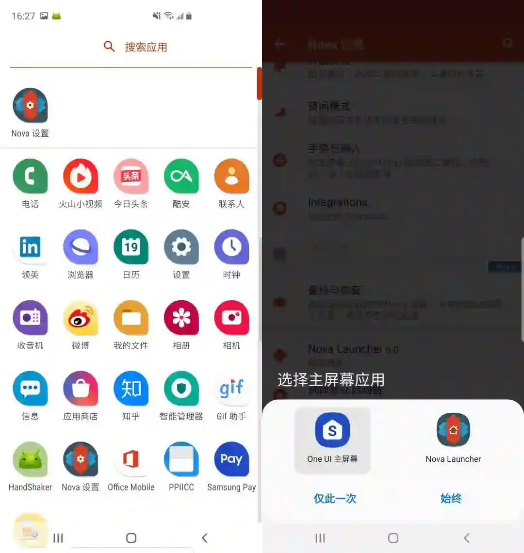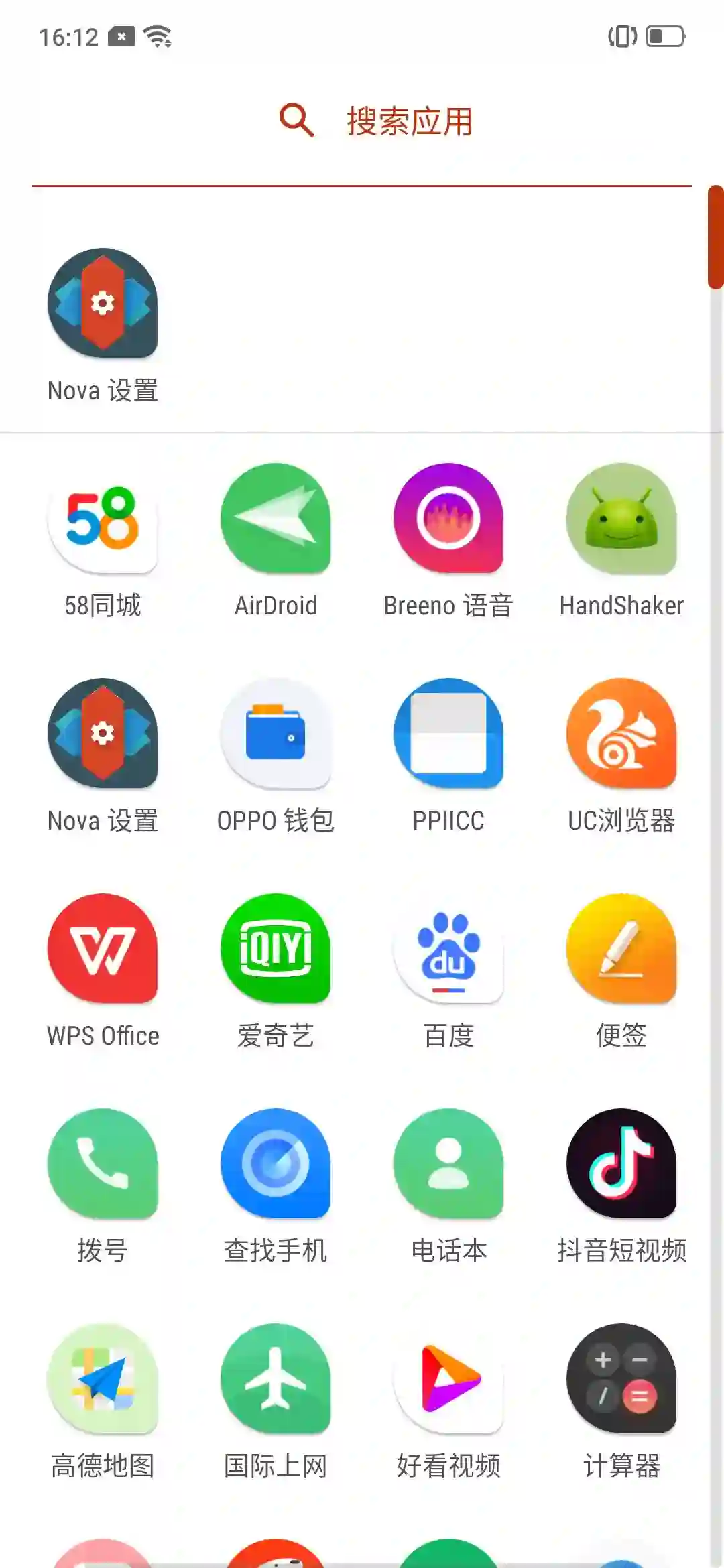 我们在 OPPO Reno 上安装了一款知名度比较高的第三方桌面 Nova,点击打开后,功能似乎一切正常,二级抽屉可以打开,图标形状也能自行设置。