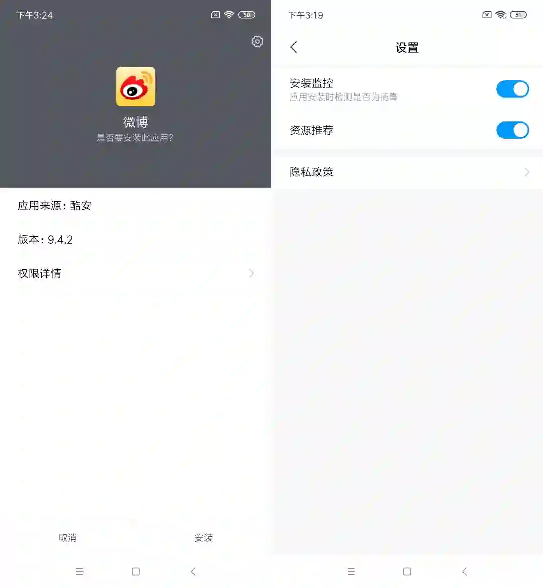默认状态下安装第三方渠道应用,系统会进行扫描检测并推荐其他应用,但可以直接在设置界面关闭。