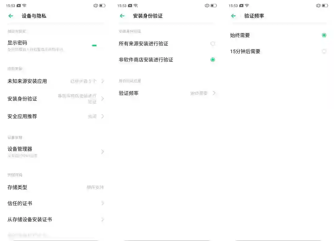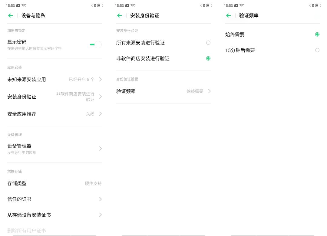另外,安装应用时的联网检测不能手动关闭,在进入设置的“设置与隐私”中可以调节频率为 15 分钟后再验证。