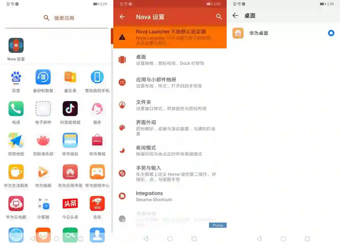 经测试,Nova 桌面可以正常安装并打开,但不能设置为默认桌面。在系统默认应用设置中,有且仅有华为桌面一个选项。