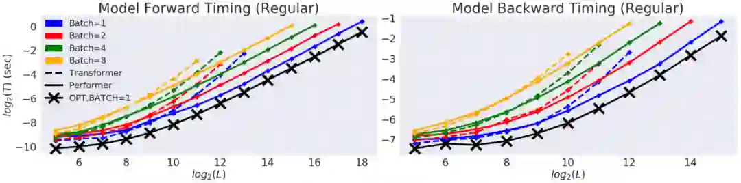 Performer 和 Transformer 在长度为 8192 的蛋白质序列上的性能。