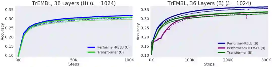 在 One Billion Word Benchmark (LM1B) 数据集上,研究者将原始预训练 Transformer 的权重迁移至 Performer 模型,使得初始非零准确度为 0.07(橙色虚线)。但在微调之后,Performer 的准确度在很少的梯度步数之后迅速恢复。