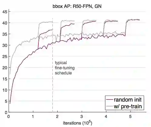 图1:我们在COCO train2017数据集上使用ResNet-50 FPN[26]和GroupNorm[48]训练Mask R-CNN[13],并在val2017数据集上评估边界框AP,通过随机权重或ImageNet预训练初始化模型。我们通过改变学习率降低(准确率提高)的迭代来探索不同的训练计划。从随机初始化训练出来的模型需要更多的迭代来收敛,但是只收敛到一个与finetuning相似的解决方案。