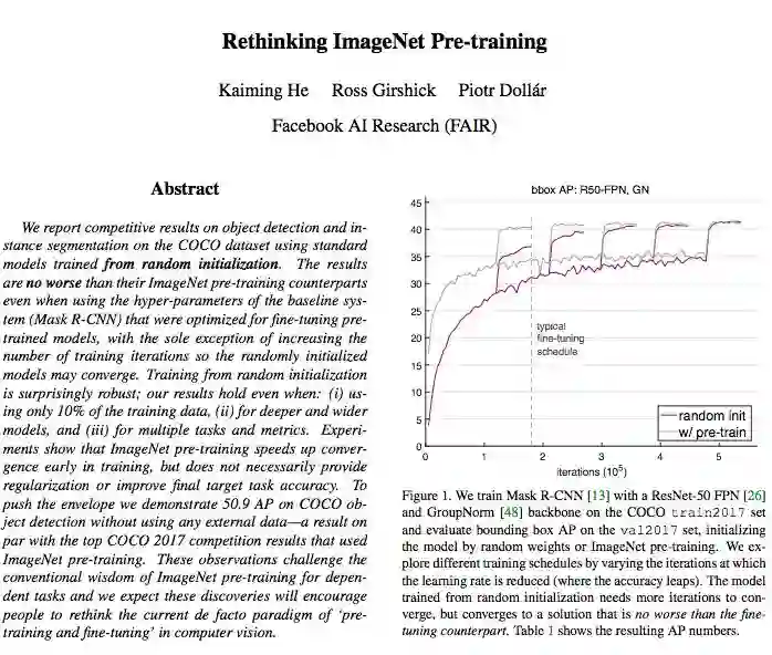 何恺明等人研究表明,在COCO数据集上进行随机初始化训练,其效果能做到不次于在ImageNet上进行预训练。