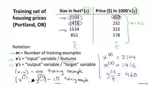 由上图可知,可以用线性函数去拟合图中所标的数据集,假设对于房子size和price的数据集如下,在我们构建的模型中,我们通常这样设置参数: