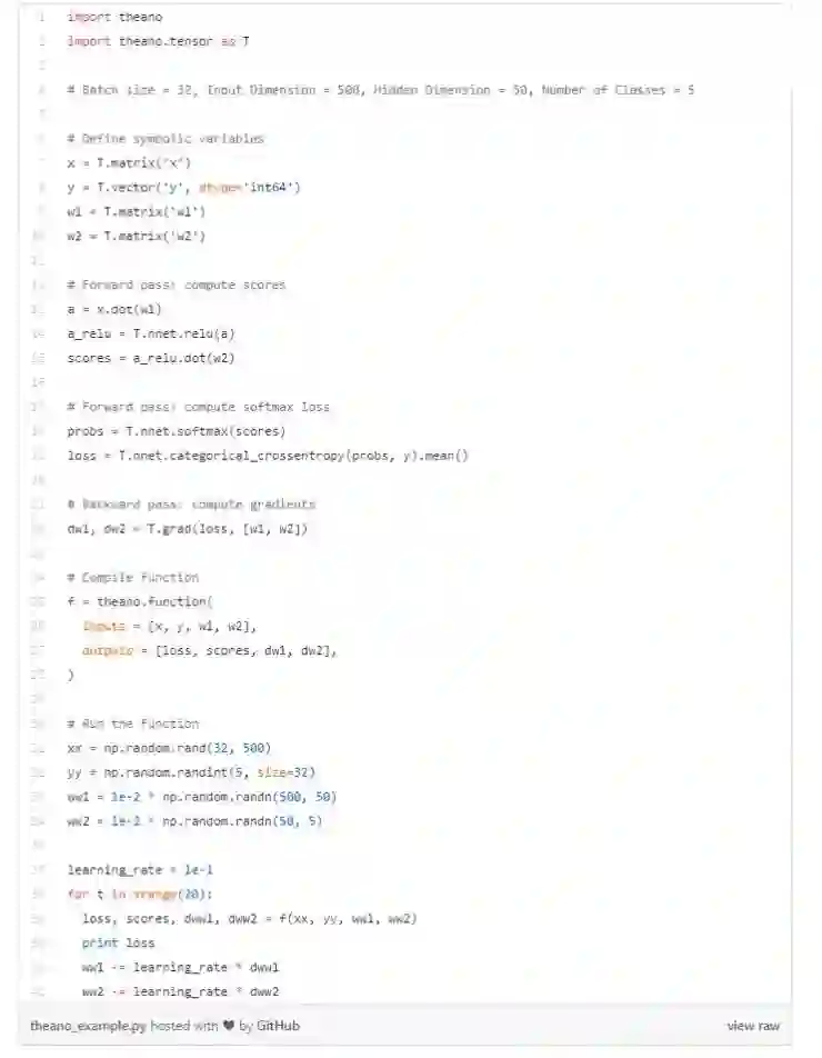 Theano在许多方面与TensorFlow相似。那么让我们来看看另一个代码示例,使用相同批量和输入/输出尺寸来训练神经网络: