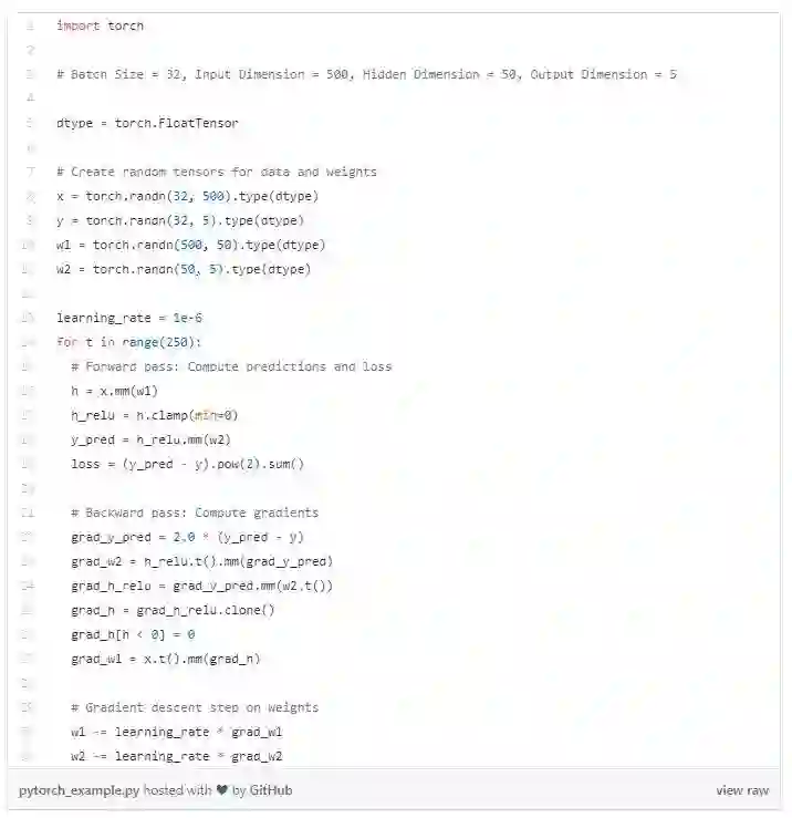 在这里我将着重谈一谈张量抽象层次。 PyTorch张量就像numpy数组,但是它们可以在GPU上运行。没有内置的计算图或梯度或深度学习的概念。在这里,我们使用PyTorch Tensors(张量)拟合一个2层网络: