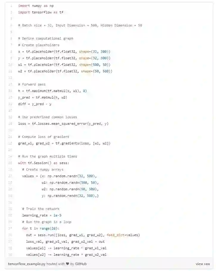 这个代码有两个主要组件:定义计算图并多次运行这个图。在定义计算图时,我为输入x,权重w1和w2以及目标y创建placeholders进行占位。然后在前向传播中,我计算目标y的预测以及损失值(损失值为y的真实值与预测值之间的L2距离)。最后,我让Tensorflow计算关于w1和w2的梯度损失。
