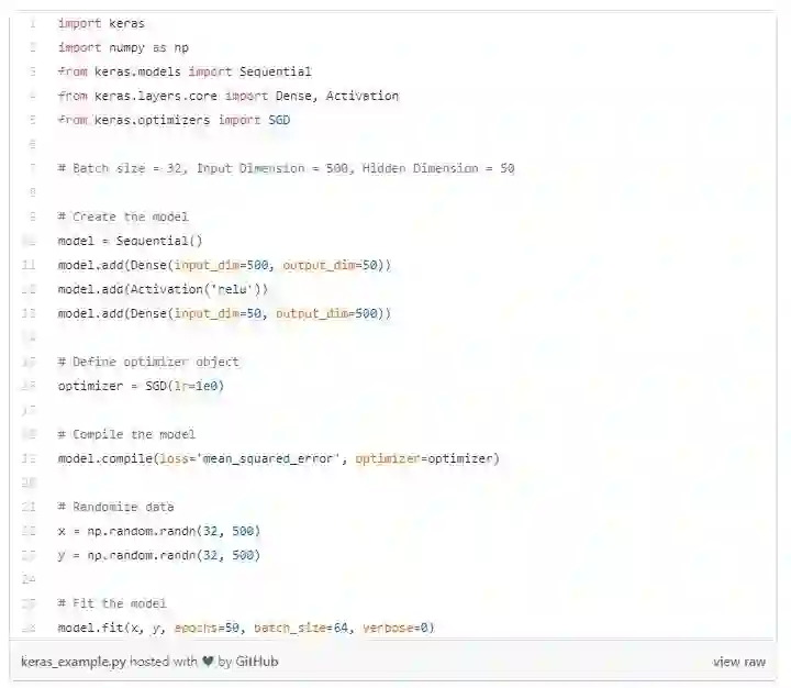 在这个例子中,对一个与之前例子中相似的神经网络进行训练,我首先将模型对象定义为一系列图层,然后定义优化器对象。接下来,我建立模型,指定损失函数,并用单个“fit”曲线来训练模型。