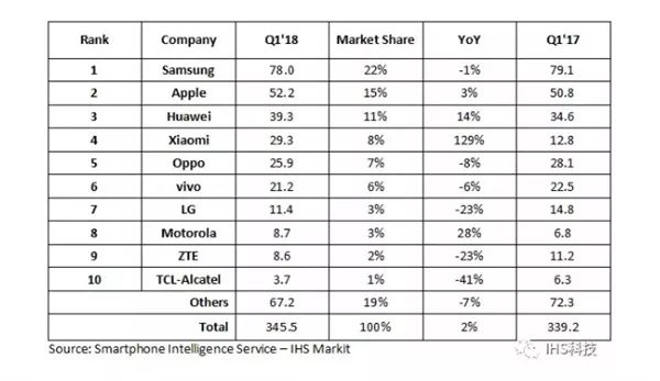 近日,IHS Markit发布了2018年第一季度全球智能手机出货量报告。报告显示,2018年第一季度全球智能手机出货34550万台,季度环比下滑11%,年度同比增长2%。