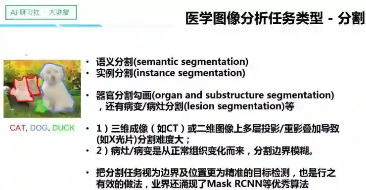 分割:这也是常规的医学图像分析中的一类任务。分割主要包括:语义分割 (semantic segmentation)、实例分割 (instance segmentation)。医学图像分析则涉及到器官分割勾画 (organ and substructure segmentation),还有病变/病灶分割 (lesion segmentation) 等。而医学影像分割跟常规图像的语义分割、实例分割不太一样。我们得看法是,把分割问题当作目标检测来处理,也方便借力于目标检测领域方法的蓬勃发展。