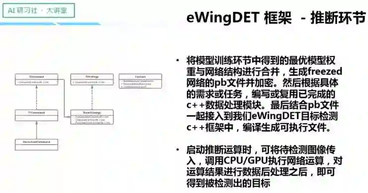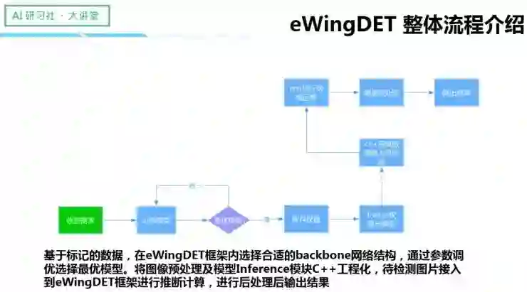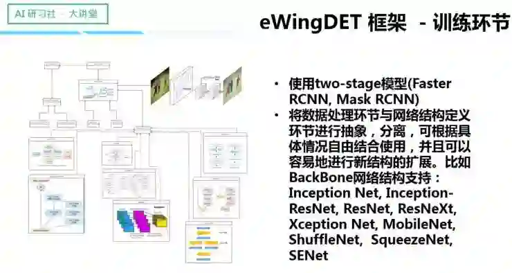 实验过程中,我们也对照 Detectron 尝试了其他一些非集成的算法,也发现了 Detectron 本身存在的一些问题,比如医学图像领域有时需要将分割和目标检测穿插使用,而 Detectron 框架无法实现二者的穿插使用。针对医学图像领域以及 Detectron 自身存在的一些问题,我们内部优化出一个框架——eWingDET 框架。它的特点和优势包括:
