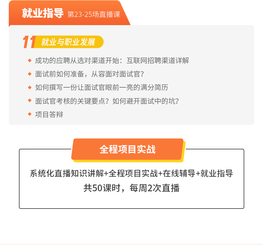 在课程的最后,我们也会给大家做好就业辅导。这部分内容包括如何找工作、如何撰写简历、如何让自己拿到更多内推机会以及如何做好职业规划等等,已经全部打包放在课程中啦,就等你来学!