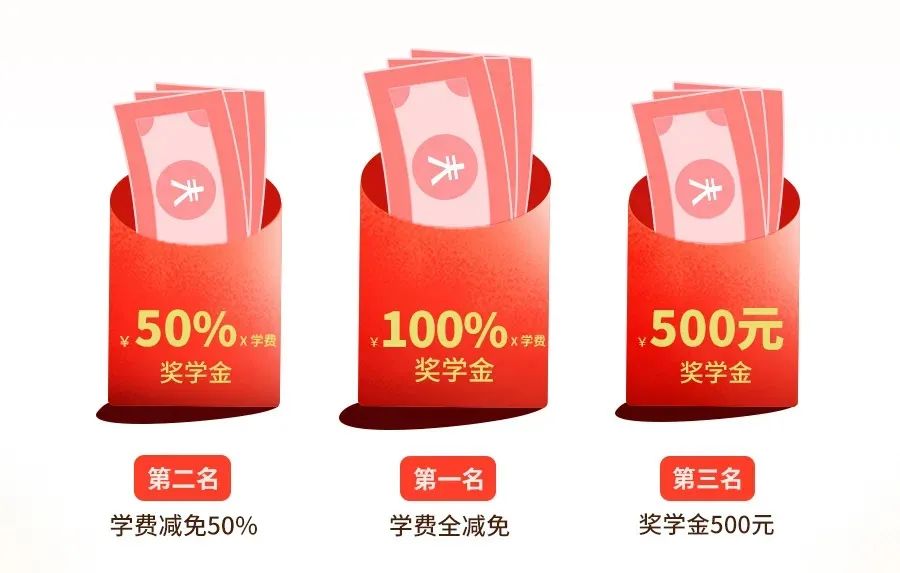 我们还为优秀学员准备了奖励:在课程结束时,我们会以本学期总成绩为准,给前三名同学颁发奖学金,第三名获得500元,第二名学费减免50%,第一名学费全减免!