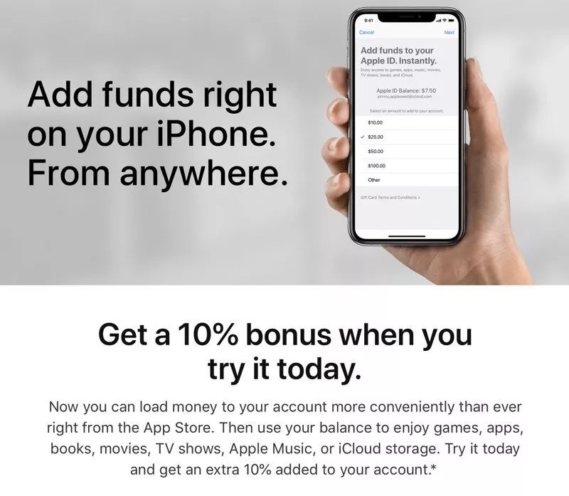 据外媒消息报道,今天,苹果通过电子邮件向美国当地用户推送了一项新的充值促销活动,声称用户只要向 App Store 和 iTunes Store 的账户 Appel ID 充值,就可以获得充值金额 10% 的额外奖励。
