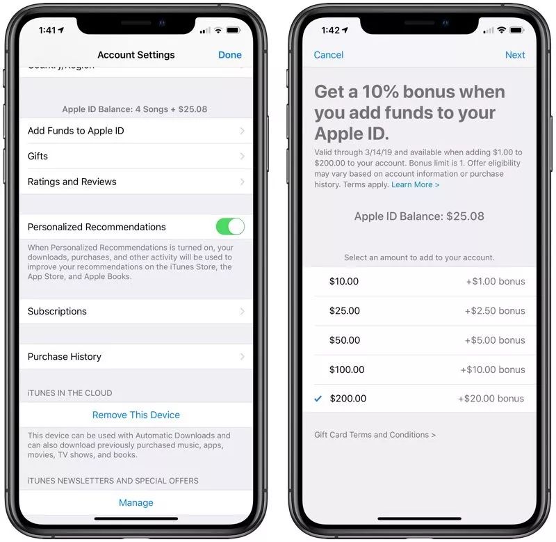 根据苹果描述,当用户通过信用卡或借记卡直接向自己的 Appel ID 账户充值时就能获得奖励,奖励的金额同样可用于 App Store iTunes 和 iCloud 等服务的消费,不过最高只能获得 20 美元奖励,也就是最高充值 200 美元之后,最终会到账 220 美元(其中 20 美元为苹果赠送的奖励金)。
