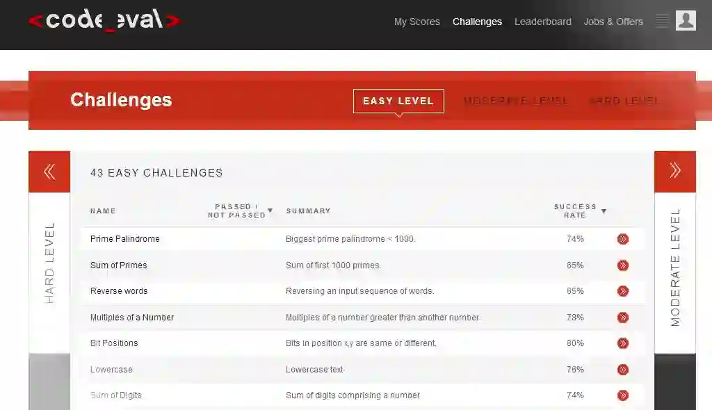 CodeEval 与 HackerRank 类似,它也提供了一系列公司赞助的编码挑战,如果能够很好的完成挑战,还可能帮助你找到工作或者是现金鼓励等。公司会举办竞争挑战赛,以此来招募新开发人员进行工作。参赛者在这里看到当前的挑战列表。