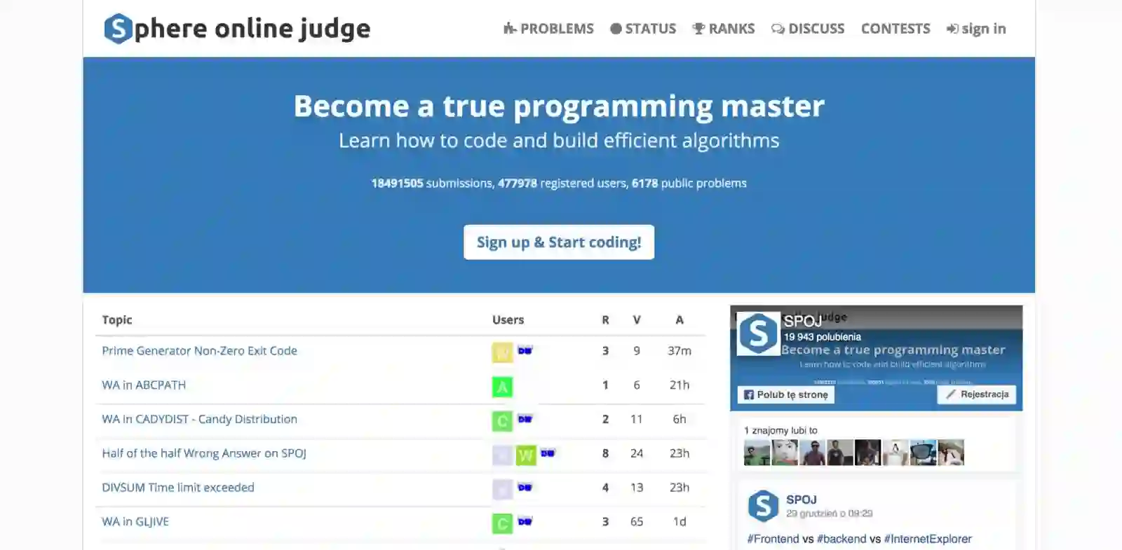 Sphere Online Judge(SPOJ)是一个在线判题系统,提供 20000 多个编程挑战。它支持输入所有你可以想到的编程语言,而且在它背后还有一个优秀社区始终如一地有效帮助着社区的论坛。可以直接通过在线编辑器中提交代码。SPOJ 还举办了自己的竞赛,并有一个区域专门供用户讨论编码挑战。他们目前没有像其他网站那样提供任何官方解决方案或社论。