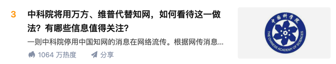 这周一,中科院和知网都对此事进行了初步回应。中科院表示,停用消息属实,并将用万方、维普替代知网。知网方面最初只简单回应了消息「不属实」。经过了几天的发酵,关于中科院与知网的相关讨论仍然在知乎热榜上。