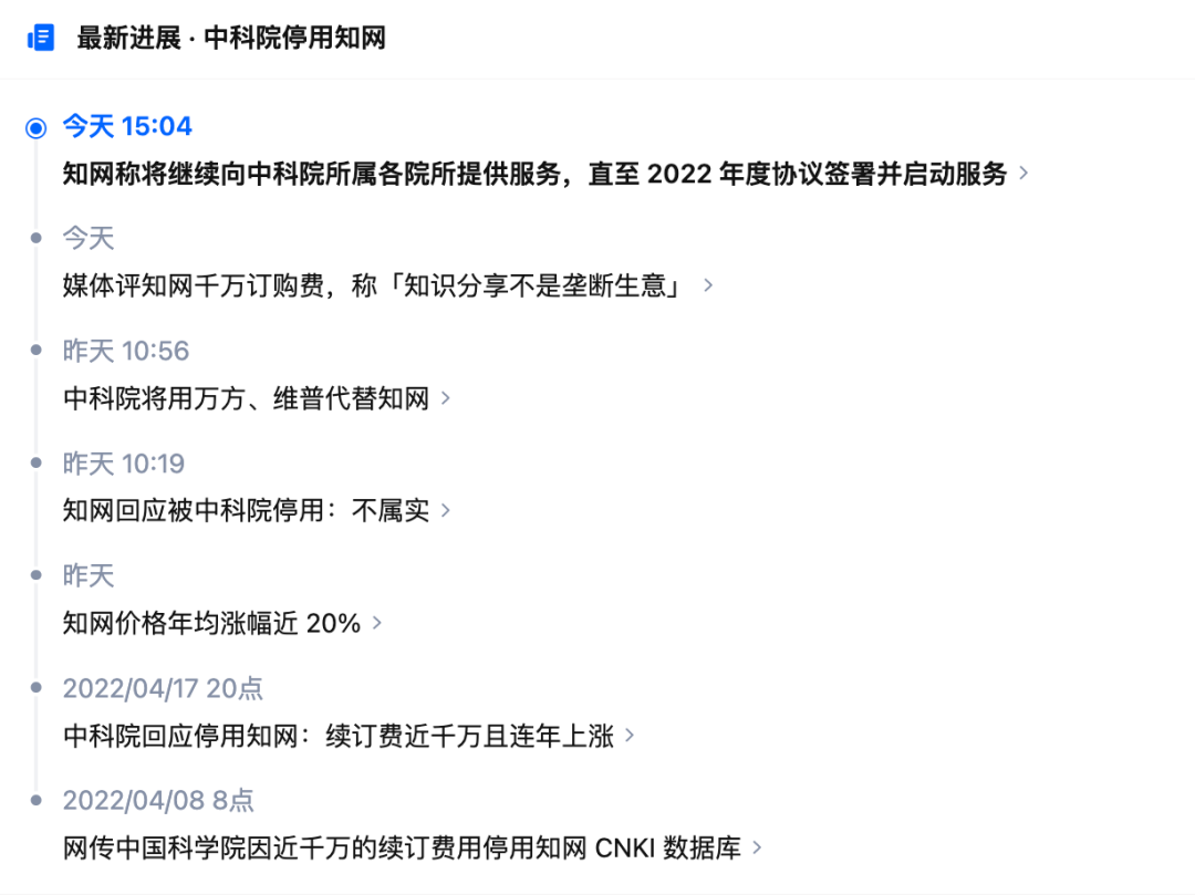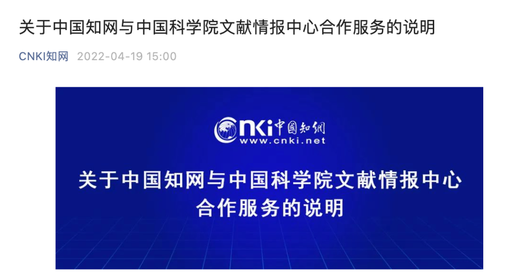 4 月 19 日下午,知网在其官方公众号上就「与中国科学院文献情报中心合作服务的说明」进行了正式回应。知网称将继续向中科院所属各院所提供正常服务,直至 2022 年度协议签署并启动服务。