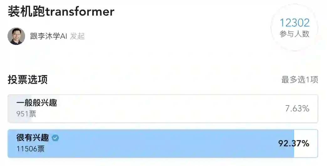 在还没出装机视频前,李沐老师曾发起了一个小小的问卷调查,趁着显卡降价,看下童鞋们对装机跑Transformer有多大兴趣。
