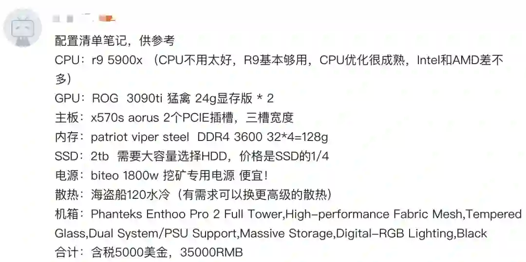 GPU选好以后(华硕的ROG), 剩下的配置就比较简单。CPU用的是AMD的12核CPU,主板是号称PCIE 4.0 16的某牌子,硬盘是2 TB的M.2的硬盘,风扇是120毫米水冷风扇,加一个全尺寸机箱。