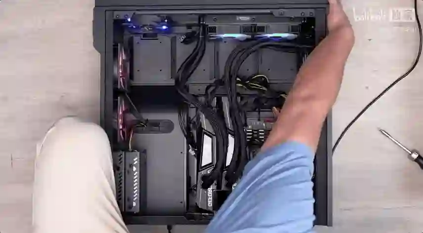 把GPU放进去之后,把螺丝拧上。然后把风扇装进去。
