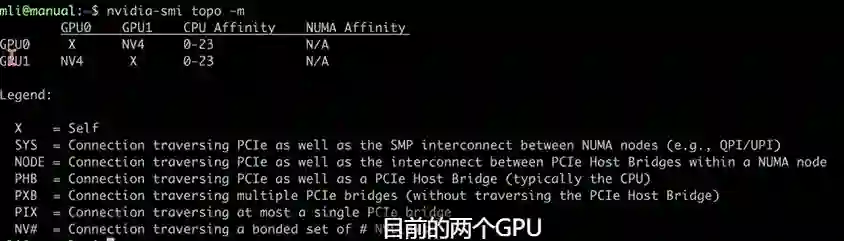 可以看到两个GPU由NV4连接。4表示4个通道,这就代表连接是正常的。