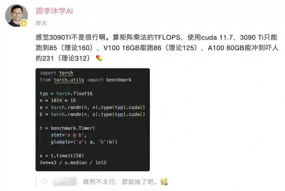 沐神自己表示,感觉3090ti的卡不是太行。马上有网友搭腔,「不行就抽了送人吧。」