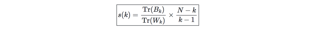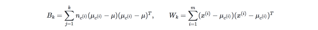 Calinski-Harabaz指数—记k为类的数量,XX和XX是类间、类内矩阵的dispersion矩阵分别表示为: