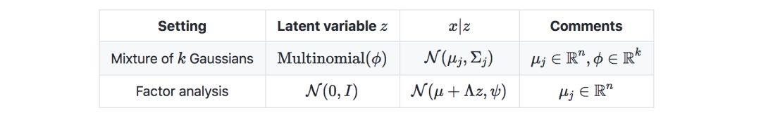 隐变量—是指使估计问题难以解决的隐藏/未观察到的变量,通常表示为z。下表是涉及到隐变量的常用设置: