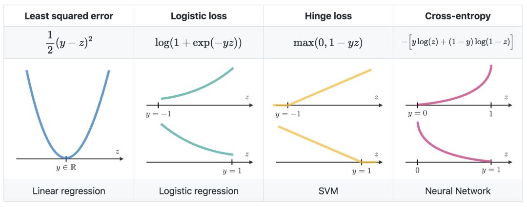 损失函数—一个损失函数可表示为L:(z,y)∈R×Y⟼L(z,y)∈R,它将与实际数据值y对应的预测值z作为输入,并输出它们之间的差异。常见的损失函数归纳如下: