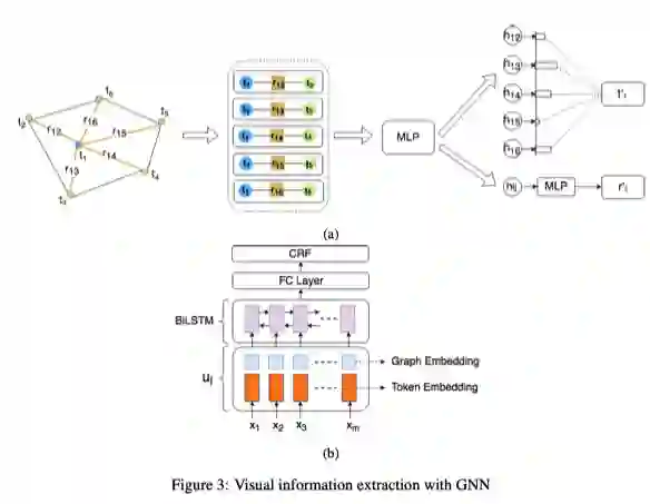 对于视觉信息丰富的文档的结构不仅仅由文本内容的结构决定,与布局、排版、格式、表/图结构等视觉元素同样相关.例如收据、证书、保险文件等.Liu等人提出的利用图卷积神经网络建模视觉元素丰富的文档,首先通过OCR系统获得一组Text Blocks,每一个Text Block包含其在图像中与文本内容的坐标信息,将其构成一个完全连通的有向图,即每个Text Blocks构成一个节点,通过Bi-LSTM获取节点的初始特征,边的初始特征是相邻文本块与当前文本块之间的相对距离以及这两个文本块的长宽比。对“节点-边缘-节点”三元特征集进行卷积,实验表明,视觉信息发挥了主要作用,增加了文本识别相似语义的能力,对视觉信息也起到一定的辅助作用。