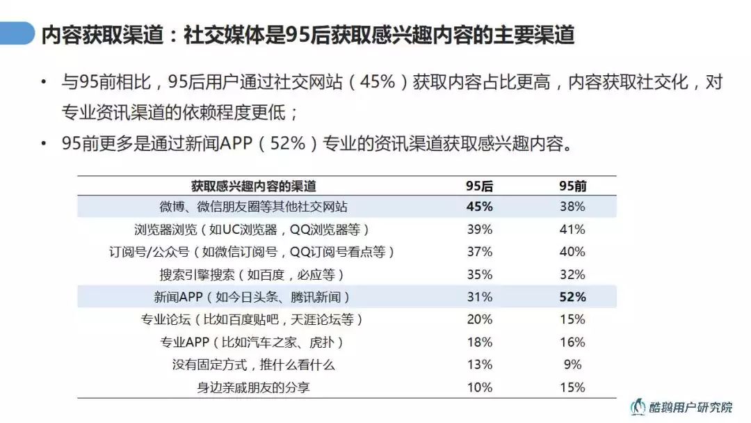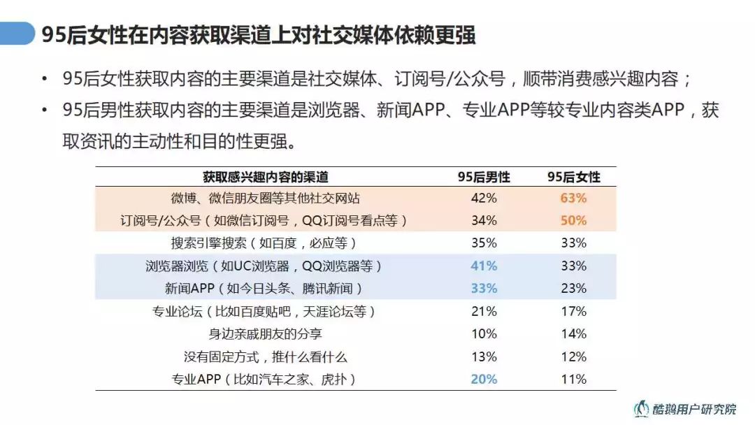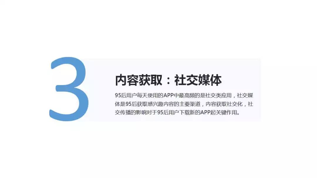 95后用户每天使用的APP中最高频的是社交类应用,社交媒体是95后获取感兴趣内容的主要渠道,内容获取社交化,社交传播的影响对于95后用户下载新的APP起关键作用。