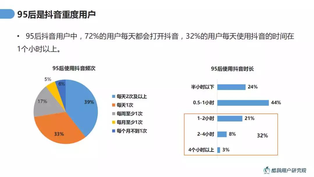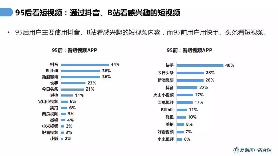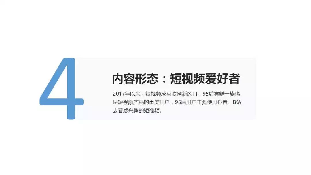 2017年以来,短视频成互联网新风口,95后尝鲜一族也是短视频产品的重度用户,95后用户主要使用抖音、B站去看感兴趣的短视频。