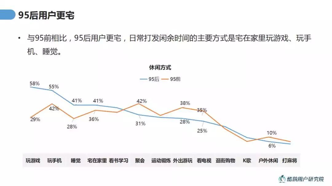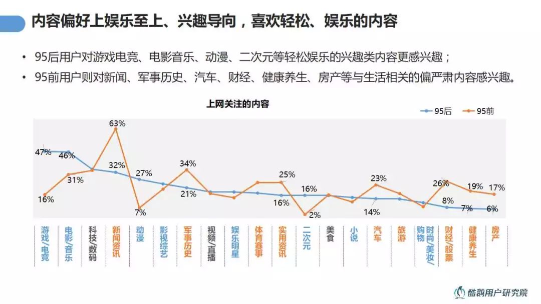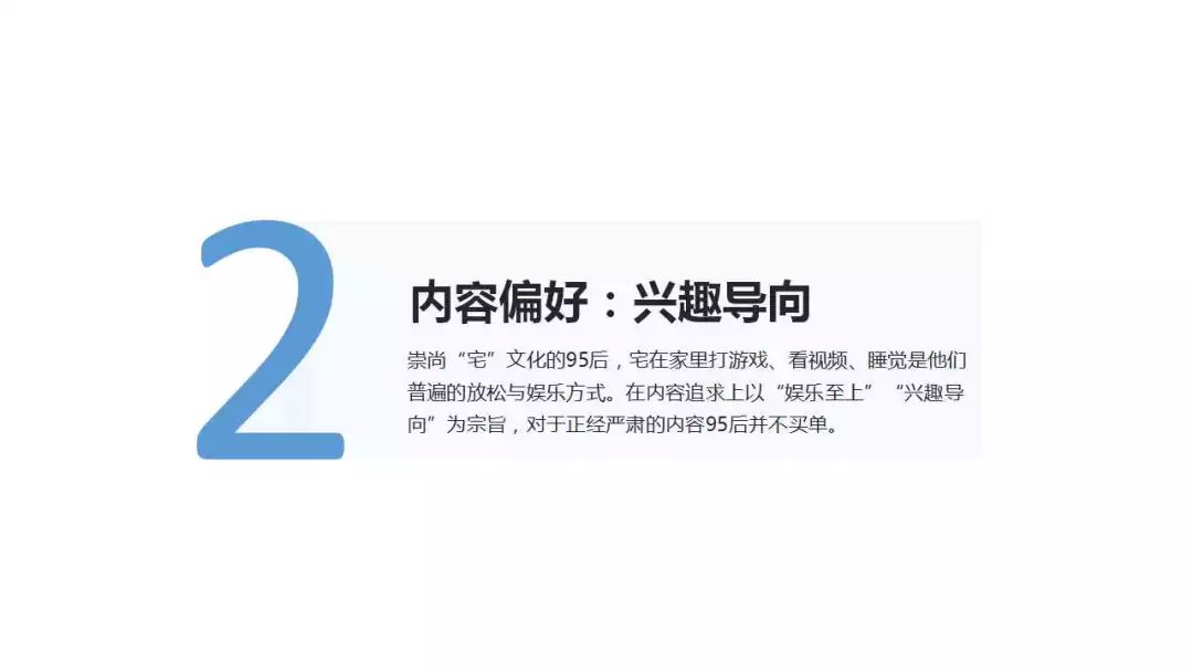 崇尚“宅”文化的95后,宅在家里打游戏、看视频、睡觉是他们普遍的放松与娱乐方式。在内容追求上以“娱乐至上”“兴趣导向”为宗旨,对于正经严肃的内容95后并不买单。