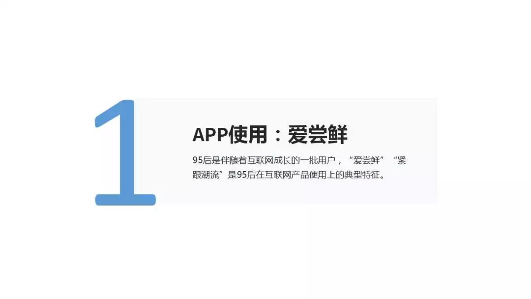 95后是伴随着互联网成长的一批用户,“爱尝鲜”“紧跟潮流”是95后在互联网产品使用上的典型特征。