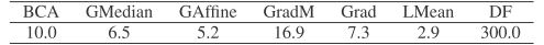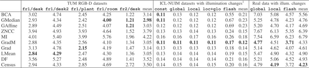 针对视觉里程计的评估结果见表4,平均值见图3右图。在TUM数据集上,基本的BCA算法表现良好,GMedian方法性能最好。GradM方法在合成数据集上的结果最好。但是在真实的数据中,Census表现地最好。