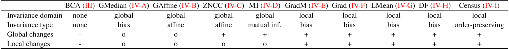 基本的直接法使用了光照一致性假设(BCA),在此基础上作者选择了几种变体,对适用于直接法SLAM的具有实时性能的算法进行评估。包括使用全局光照变化模型、图像梯度表示局部光照变化和基于块的方法。表1列出了各方法理论上的光照不变性。