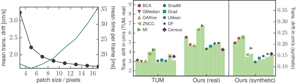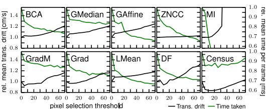 对于深度图,作者设定一个灰度梯度阈值,低于该值的像素会被丢弃。该阈值的选择以最小化漂移为准。平移漂移的相对变化和每帧的处理时间见图4。