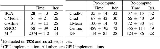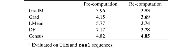 基于描述符的算法可以预先计算或是在优化中的每回迭代中进行重新计算,对这两种方法的评估见表3。可以看出重新计算总是比预先计算的漂移小,对基于梯度的方法也是如此。