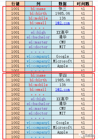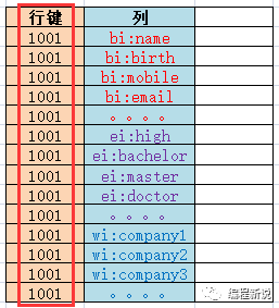 一个行键、一到多列(包括数据)组合起来叫做一行(Row)。下图中所有1001的数据合起来相当于Hbase中的一行,1002的相当于另一行: