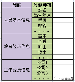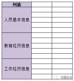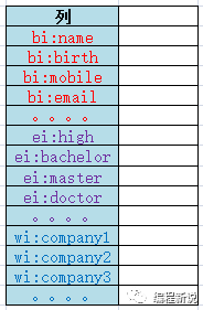 一个非常常见的例子,去面试的时候,一般前台MM都会让填一张表,通常信息很多,每个公司又不尽相同。但大致可以分三类:人员基本信息,教育经历信息,工作经历信息,这三个类别其实就相当于三个列族。如下图: