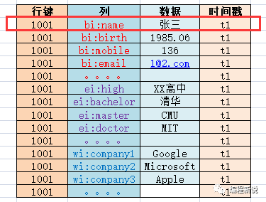 在传统数据库中每一行的唯一标识符叫做主键,在Hbase中叫做row key(行键)。如下图:
